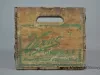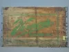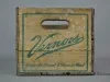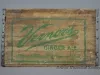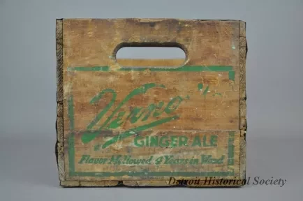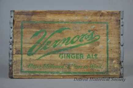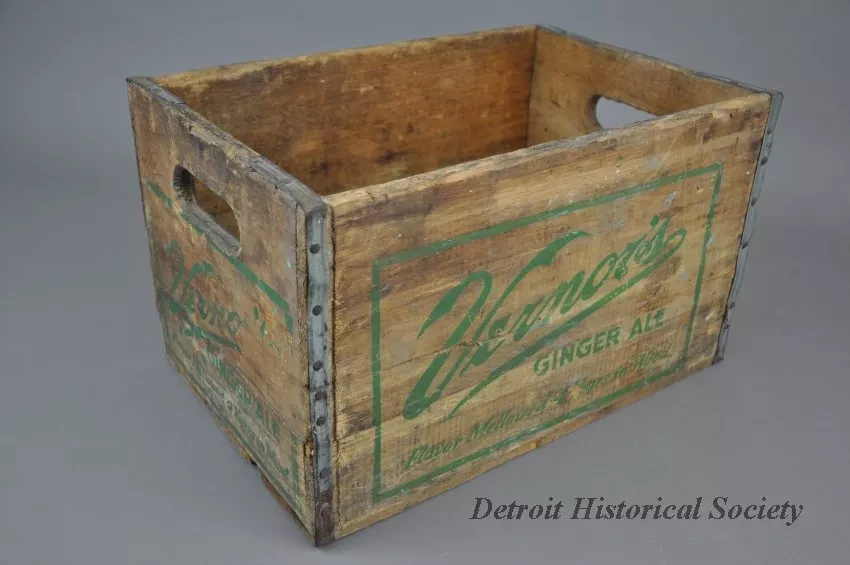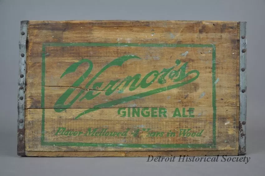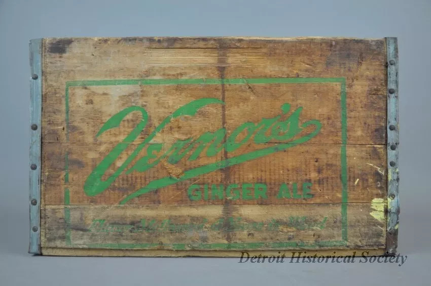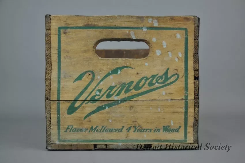 One Vernor's Ginger Ale delivery crate. The crate has wood slats on all four sides and on the bottom. The end panels have cutouts near the top for handles and are stamped with green text that reads "Vernor's Ginger Ale, Flavor Mellowed 4 Years in Wood." Edges on the end panels are reinforced with strips of galvanized steel that have been nailed in place.