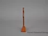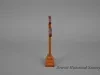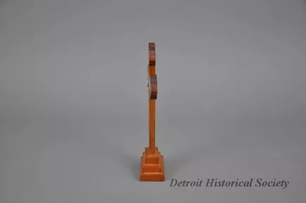 One small wood Calvary cross. The cross has trefoil ends at the sides and top and is mounted on a rectangular 3-step base. The cross and trefoils are made of walnut with the base and a center inlay on the cross being made of a lighter wood (possibly pine). The center inlay is located only on the front side of the cross. The entire cross has been finished with a glossy varnish or lacquer which had darkened slightly with age. A paper label on the underside of the base has handwritten ink text that shows "Walnut from old pews, outline of cross, Old Mariner's Church, Built 1849, Moved to Civic Center 1955."