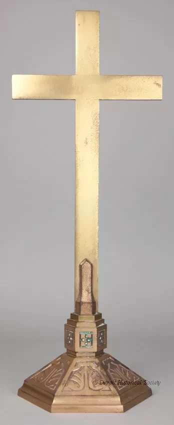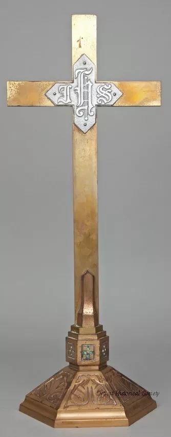 One heavy brass altar cross from St. James Lutheran Church, Detroit. The cross is made of solid brass rectangular bars (1.5" wide x 0.47" thick) which have a decorative aluminum ornament affixed at the front intersection that shows the letters, "IHS," in old English script. The cross is mounted on a hexagonal cast brass base that has decorative matching relief designs on each of the six slanted top faces. The exterior surfaces of the cross and base have a smooth finish. A piece of unfinished wood is attached to the underside of the base with a single screw at the center. No manufacturer's name or marks are shown.