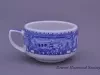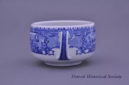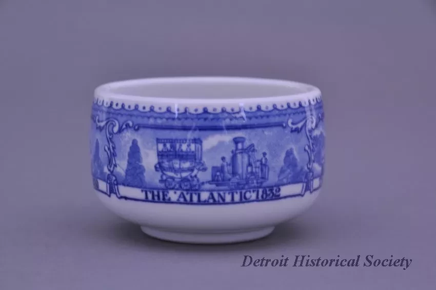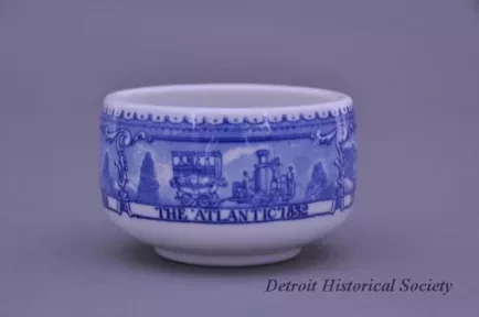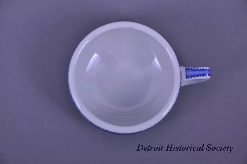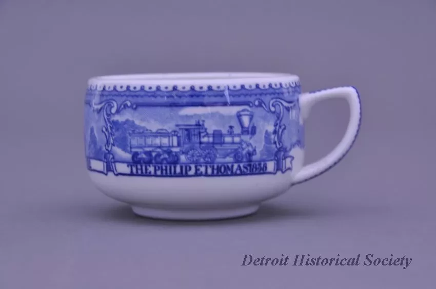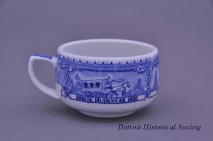 China Demitasse Cup. Blue on white images of the "The Philip E Thomas 1832," "Horse Drawn Car 1830," and "The Atlantic 1832," each identified by a continuos banner below, surround the cup. An egg and dart motif forms the upper border of the design. The handle is adorned with a similar vertically-oriented, double-sided egg and dart pattern.
