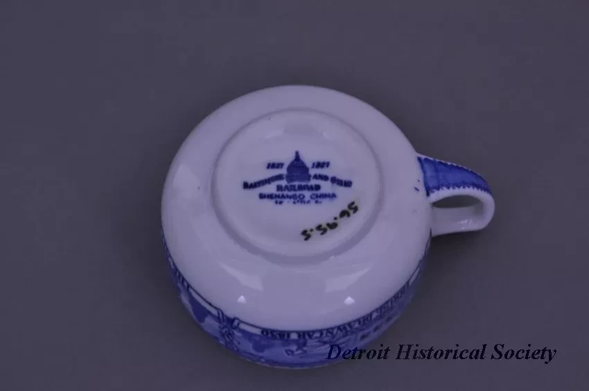 A maker's mark depicting a two-tiered dome adorned with a column at its peak is located on the cup's base. The dome is flanked with the dates 1827 and 1927. The text surrounding and below reads, "Baltimore and Ohio Railroad, Shenango China, New Castle, PA."