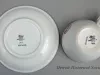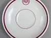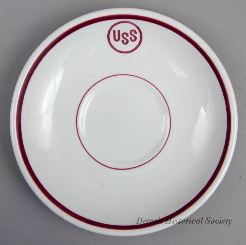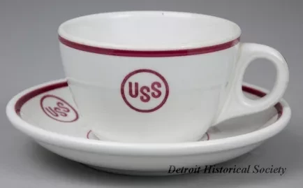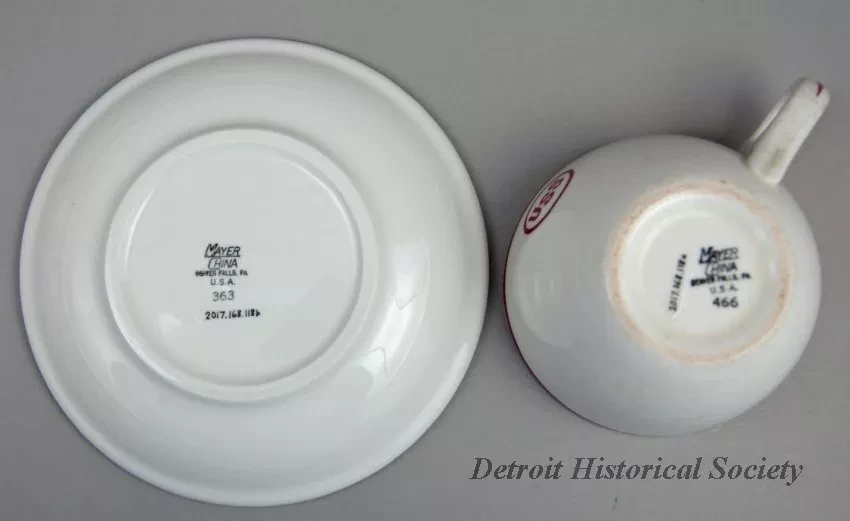 One coffee cup and saucer from the dining room of the bulk carrier, MV ROGER BLOUGH, of the United States Steel Corporation. Both pieces are made of white glazed china. The cup has a rounded top edge, curved sides, and a plain round handle with a narrow red stripe on the outside. A narrow red stripe encircles the cup on the outside top edge. The company logo, consisting of a red circle with the letters, "USS," at the center, is stamped on the front side of the cup. The saucer has plain, curved sides with a thickened outer edge. Narrow red stripes encircle the saucer on the outside top edge and at the cup base. Also, a matching company logo is stamped on the top surface of the saucer just below the outer edge. The underside of the cup is stamped with black text that reads "Mayer China, Beaver Falls, PA, U.S.A." and "466." The saucer is stamped with black text on the underside that reads "Mayer China, Beaver Falls, PA, U.S.A.," and "363."