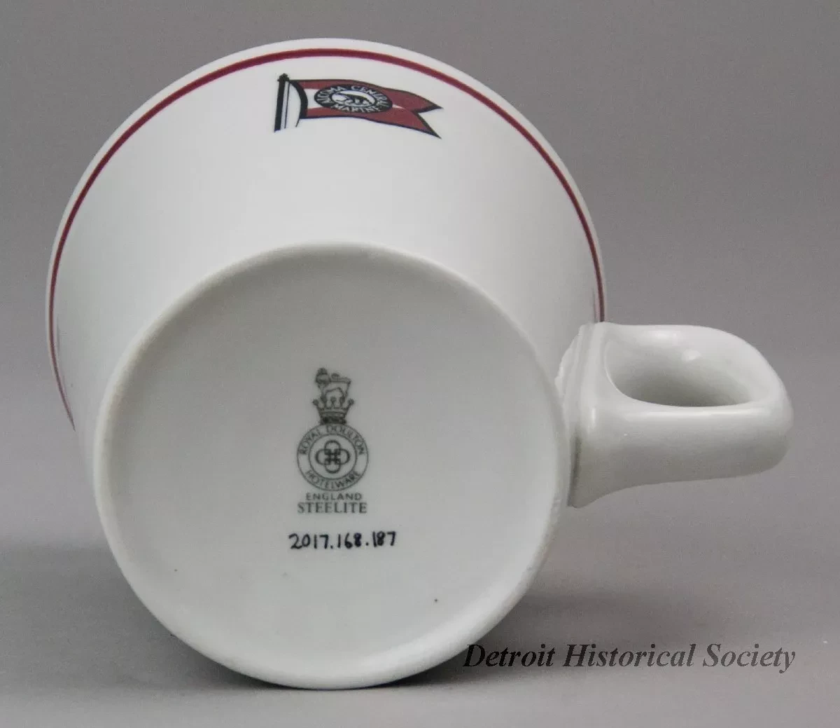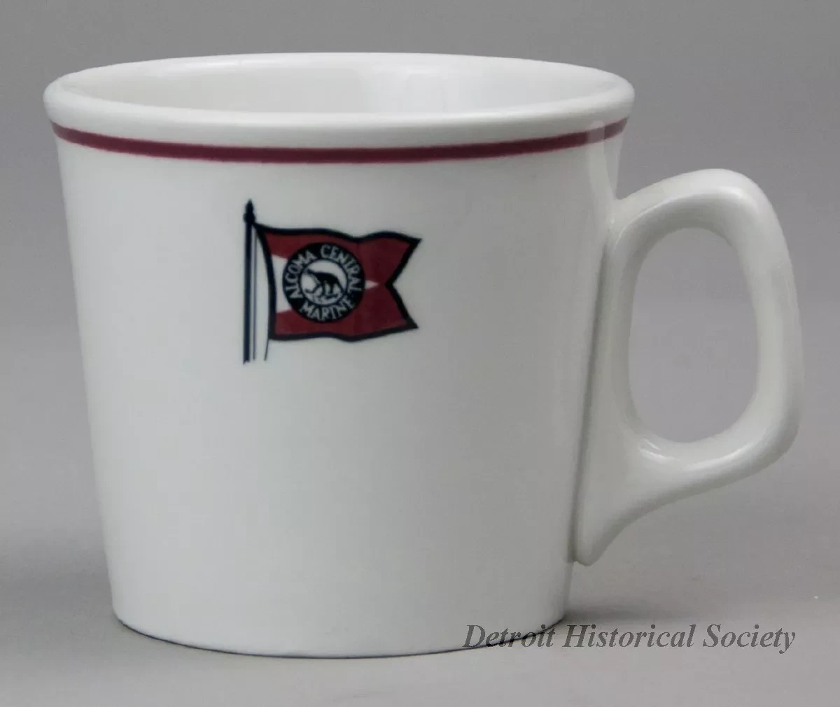 One coffee cup from a dining room of one of the steamships of the Algoma Central Railway fleet. The cup is made of heavyweight, white glazed china. It has a rounded top edge that has a slight outward curve, and a stylized rectangular handle with a flat thumb rest. The straight sides flare inward slightly to form a circular base. A narrow red stripe encircles the cup along the outside top edge. A red/white/black image of the "Algoma Central Marine" company flag is stamped on one of the sides beneath the red stripe. The underside is stamped with a small lion/crown logo and black text that reads "Royal Doulton Hotelware," and "England, Steelite."