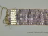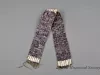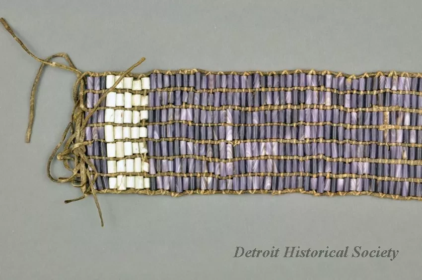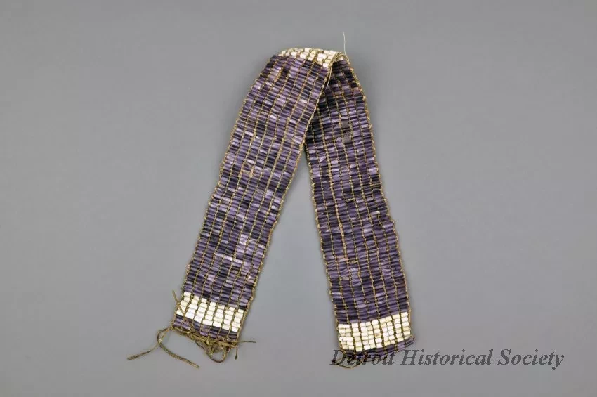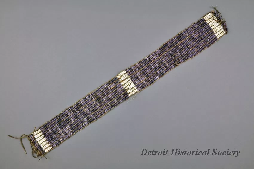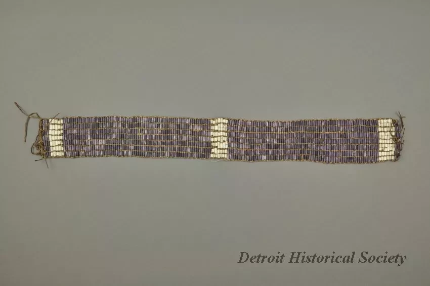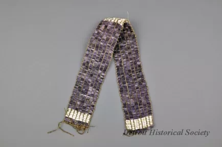1 - wampum belt. Purple & white shell beads on leather cords. 7 rows wide, cylindrical beads. Section of purple beads, then 5 rows white, then wide section of purple, then center section of 7 rows white, then repeat of wide purple section, 5 rows white, purple end.