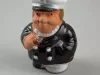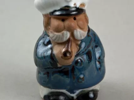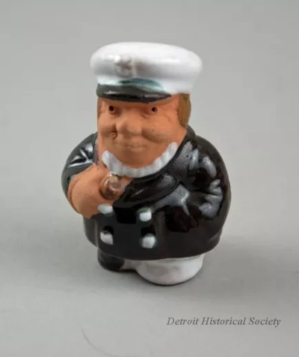 One table decoration from the Detroit Power Squadron Commander's Ball. The decoration consists of a small, hollow, glazed ceramic figure of a sea captain. The stout male figure is shown wearing a white peaked hat with a black visor, a white turtleneck sweater, a dark blue double-breasted jacket, and white pants. He is holding a pipe with his right hand. A small adhesive paper label on the underside reads "Made in Taiwan."