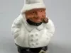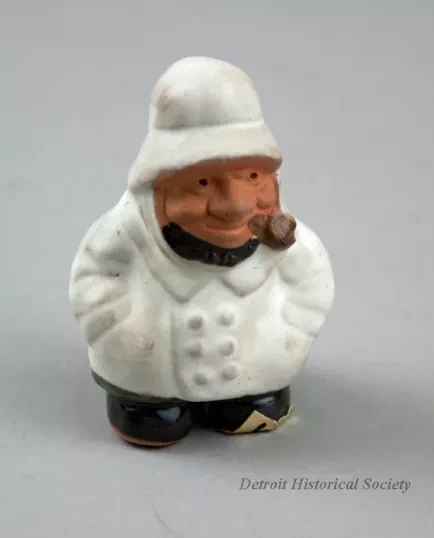 One table decoration from the Detroit Power Squadron Commander's Ball. The decoration consists of a small, hollow, glazed ceramic figure of a sea captain. The stout male figure is shown wearing a white sou'wester hat, a double-breasted white jacket, and dark blue pants. He has a brown beard and is smoking a pipe. A small adhesive paper label on the underside reads "Albert E. Price Products, Bellmawr, N.J.," and "Made in Taiwan, R.O.C."