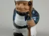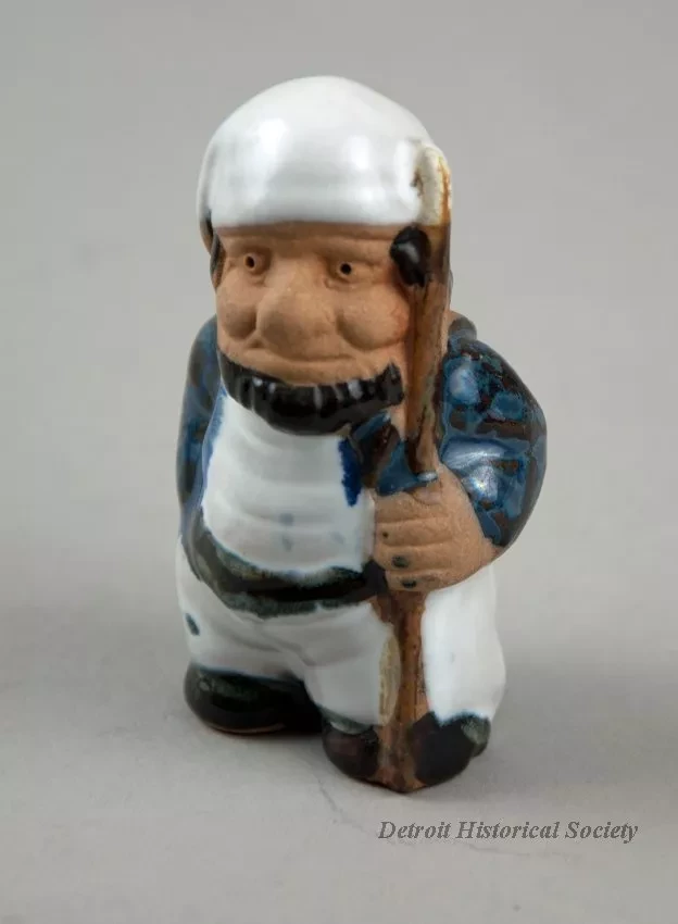One table decoration from the Detroit Power Squadron Commander's Ball. The decoration consists of a small, hollow, glazed ceramic figure of a sailor. The stout male figure is shown wearing a white voyageur's hat, a white shirt, a dark blue jacket, white pants with a black belt, and black shoes. He has a black beard and is holding a boat hook with his left hand. A small adhesive paper label on the underside reads "Made in Taiwan."
