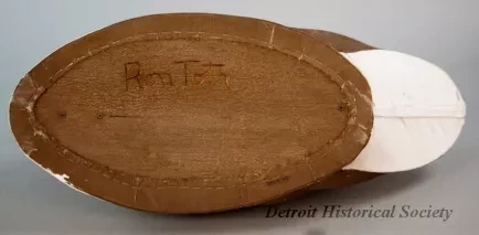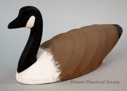 One hand made goose decoy. The decoy has a flat, oval-shaped wood base, a carved wood neck and head, interior ribs made of steel wire, and a heavy canvas covering over the body. It has been finished with black/white/gray paint and depicts a Canada Goose. Steel staples have been used to attach the canvas along the underside edge of the wood base. In addition, steel tacks have been used to attach a strip of canvas reinforcing tape along the edge of the wood base and to hold the canvas around the bottom of the goose neck. Hand carved text on the decoy underside reads "Ron Toth."