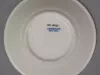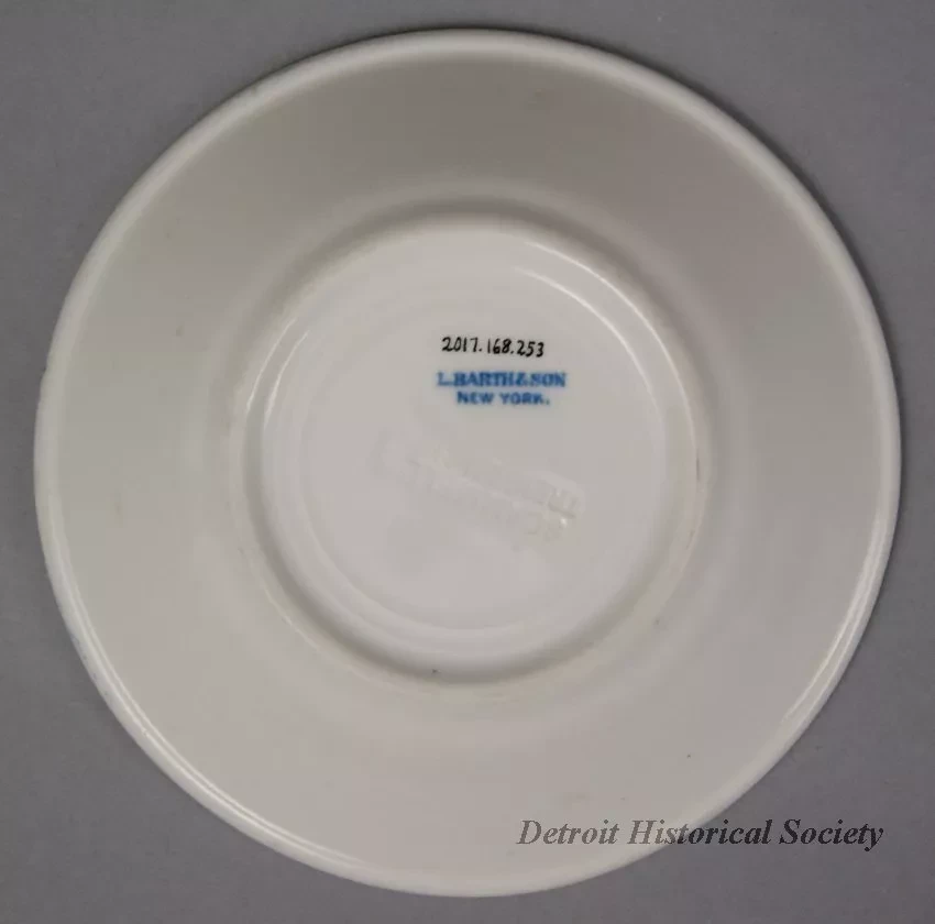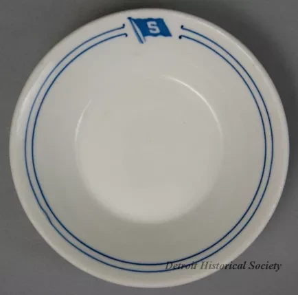 One berry dish from the dining room of the tanker, RENOWN, of the Standard Oil Company of Indiana. The round dish is made of heavyweight white glazed china. It has flat, slanted sides, a thickened outer edge, and a flat bottom. Two narrow blue stripes encircle the sides near the outer edge. At a break in the stripes, a blue/white image of the company flag is shown. Stamped text on the underside reads "Scammell's Trenton China," and "L. Barth & Son, New York."