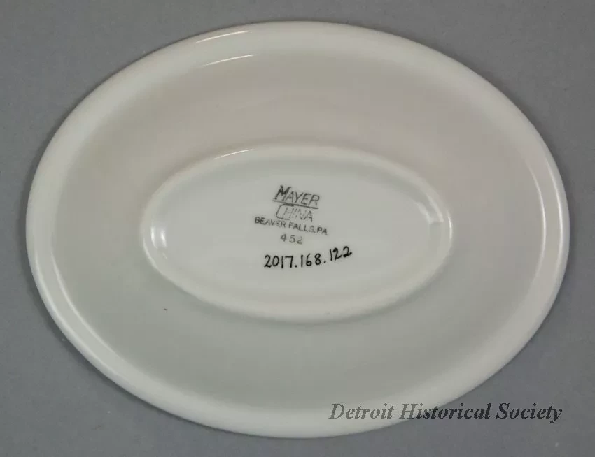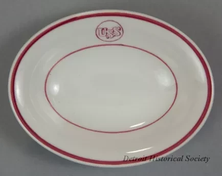 One dessert dish from a dining room of one of the steamships of the United States Steel Corporation fleet. The small, oval-shaped bowl is made of heavyweight, white glazed china. It has gently-curved sides, a thickened outer edge, and a short, oval-shaped base. Narrow red stripes encircle the top surface of the dish along the outer edge and just below the midpoint of the sides. At the center of one of the long sides between the stripes, the red "USS" company logo is stamped. The underside is stamped with black text that reads "Mayer China, Beaver Falls, PA, U.S.A.," and "452."