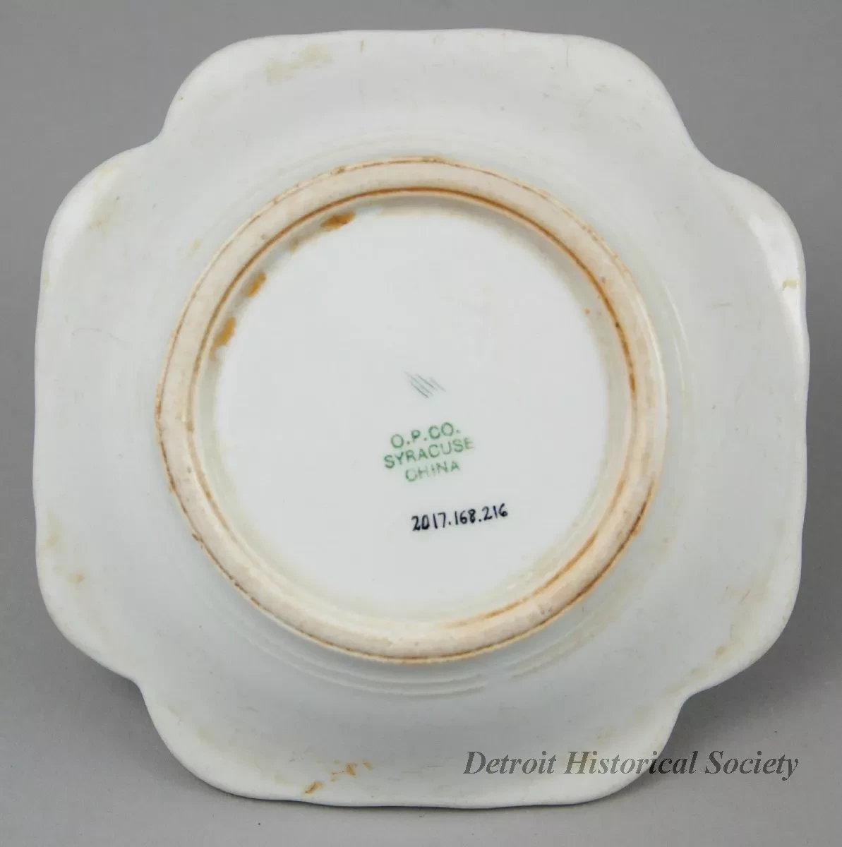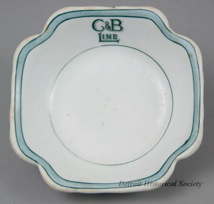 One dessert or ice cream dish from the dining room of the passenger steamship, SS Seeandbee of the Cleveland & Buffalo Transit Company (C&B Line). The round dish is made of heavyweight white glazed china. It has curved sides and a squarish top rim with inward-rounded corners. A pale blue band with narrow green edging encircles the dish along the outer edge of the rim. Also, a narrow green stripe encircles the bottom of the dish along the base of the curved sides. Green text is stamped on one side of the dish between the band and stripe that reads "C&B Line." The underside is stamped with green text that reads "O.P. Co. [Onondaga Pottery Company], Syracuse China."