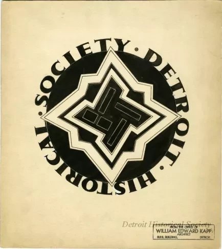 Hand-drawn design for a Detroit Historical Society logo by William Edward Kapp in ink on board. The design consists of an overhead view of the walls of Fort Shelby, including outlines of interior buildings, in white against a black circle. The corners of the walls protrude slightly beyond the edge of the circle. The text, "Detroit Historical Society" curves around the outside of the circle. "From the office William Edward Kapp, Architect, Buhl Building, Detroit," is stamped in the lower right corner.