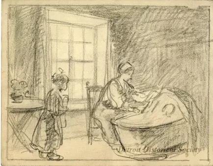 Request ImagePencil sketch on beige paper of a girl watching a woman tending to a baby in bassinet, drawn by Charles E. Waltensperger.