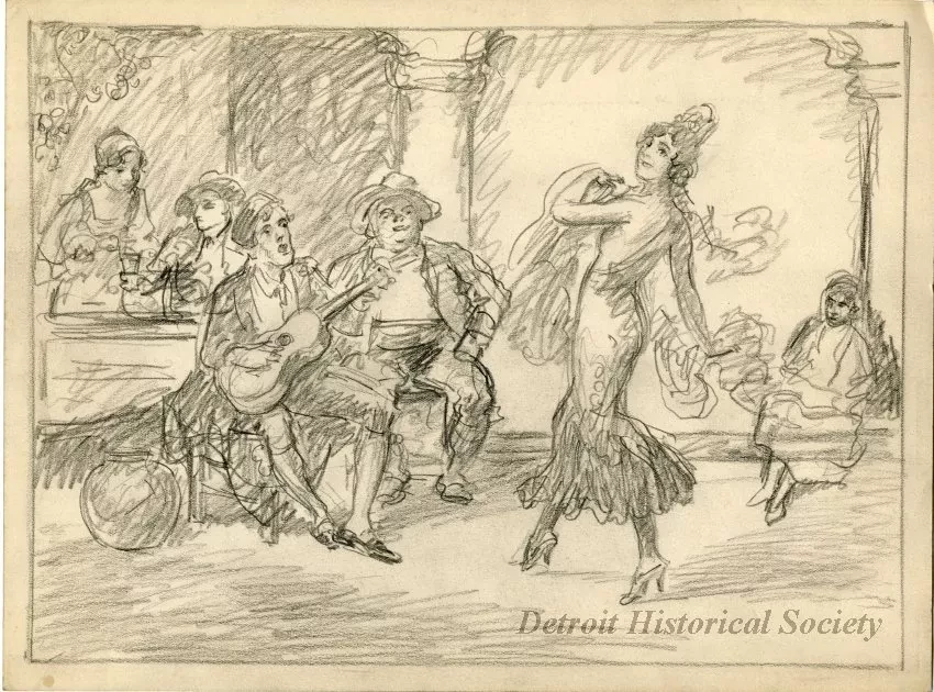 Pencil sketch drawn by Charles E. Waltensperger on beige paper of scene of a woman dancing and a man playing guitar as several other spectators look on.