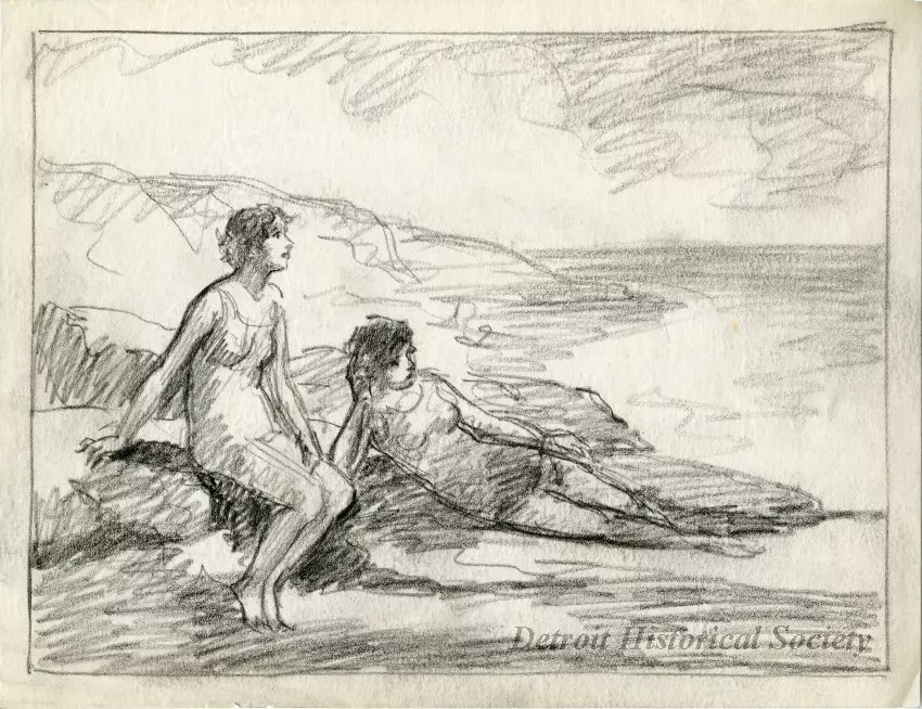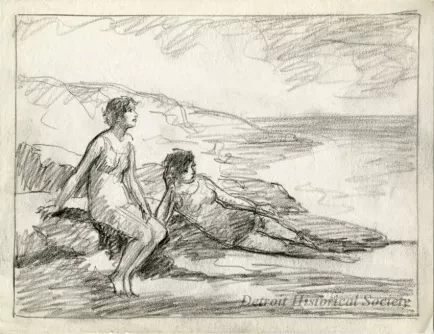 Pencil sketch drawn by Charles E. Waltensperger on white typing paper of a woman reclining and a woman sitting on rocks along a shore.