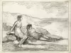 Request ImagePencil sketch drawn by Charles E. Waltensperger on white typing paper of a woman reclining and a woman sitting on rocks along a shore.
