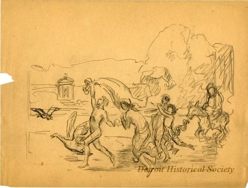 Pencil sketch drawn by Charles E. Waltensperger on beige paper of a scene of a nude male figure running while trailing a cloth behind him, followed by three robed figures, and a fourth person on the back of a small horse. A swan flies beside the man. A gazebo-like structure with columns stands in the background.