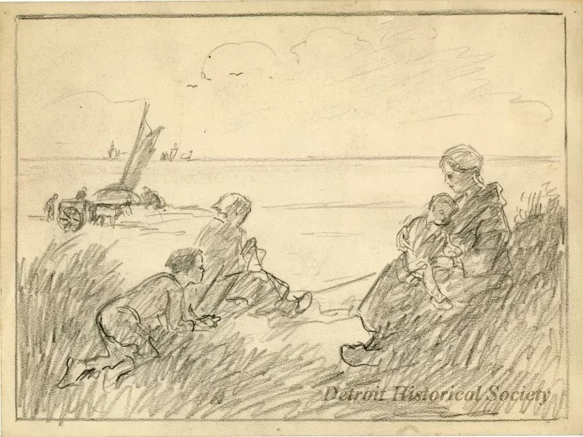 Pencil sketch drawn by Charles E. Waltensperger on beige paper of a woman sitting with a baby in her lap in the foreground beside a kneeling child, and another seated figure, while a horse-drawn wagon passes in the background. Several shapes suggestive of sail boats are further in the distance.