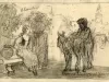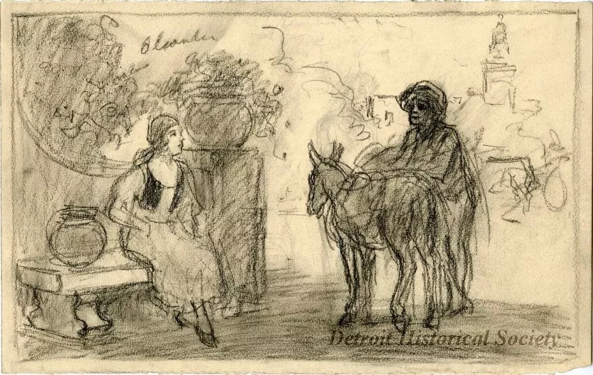 Pencil sketches drawn by Charles E. Waltensperger on beige paper of a woman seated on a bench next to another figure walking with a horse. The woman wears a dress, vest, and scarf on her head. A planter of flowers on a bannister behind the women is labeled, "oleander."