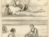 Two pencil sketches of beach scenes drawn by Charles E. Waltensperger on a single sheet of beige paper. The top sketch shows a women reclining beneath a parasol, as a baby sits near her. A handwritten note identifies the parasol as "red." The bottom sketch shows two women seated face to face in the sand.
