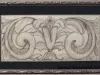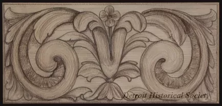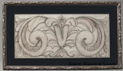 One framed black pencil drawing on vellum paper of an architectural detail for a fireplace mantel or surround. The floral and leaf detail is symmetrical and reactangular in shape. The artist has signed his name, "E. Chesney," in blue ink at the lower right corner of the drawing. The drawing is mounted in a decorative, silver-colored wood frame with a black matte and a protective glass covering.