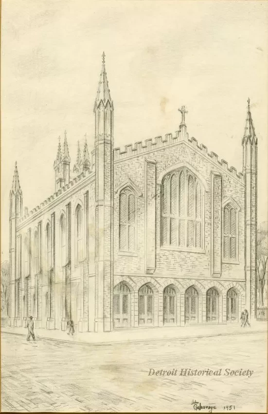 Charcoal sketch, mounted on board, of the old Mariners' Church at the corner of Larned and Rivard Streets, showing the west facade and north side of the church. Signed and dated "John Gelsavage 1951 on the bottom right. Mounted on board.