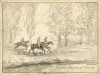 Pencil sketch drawn by Charles E. Waltensperger on beige paper of trio of figures on horseback riding through the woods. "Bridle Path Bell & Tele[?]" is handwritten below the image.