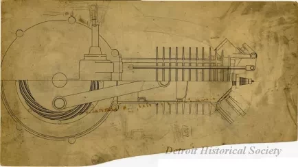 Drawing, in pencil and ink, of a profile view of a William Bushnell Stout designed motorcycle engine. The drawing is signed and dated "1909 Wm B. Stout" on the bottom near the center.