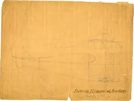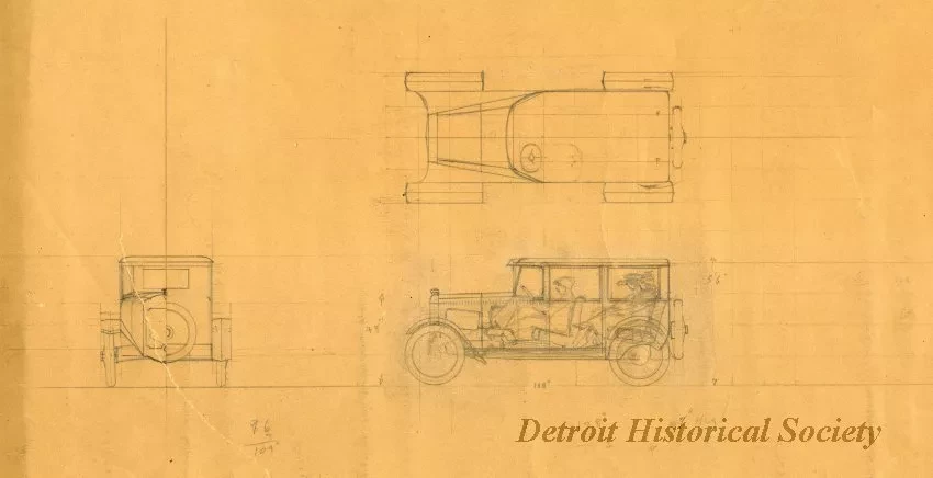 Technical drawings, done in pencil on paper, by William Bushnell Stout. One side shows a profile drawing of a Stout Batwing, with text reading "Batwing 2 cycle built at Motor Products - 1918." The other side shows a drawing of an automobile, showing a top down, left side, and rear end view. The left side view is shown with measurements.