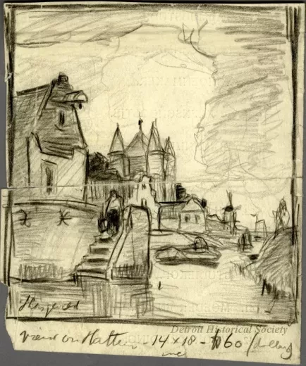 Pencil sketch drawn by Charles E. Waltensperger on beige paper showing a view along a canal in Hattem in the Netherlands. A small rowboat is in the foreground, and windmills stand in the background. "View on Hattem - 14x 18 - 60 dollars," is handwritten beneath the drawing. The paper was cut from a page of a Dutch art gallery catalog.
