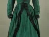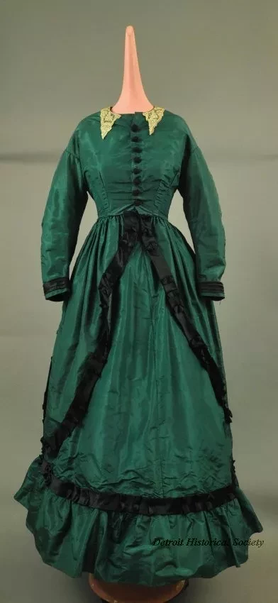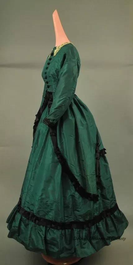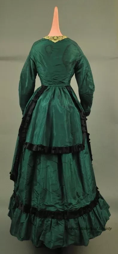 Woman's handmade blue/green taffeta dress. The dress has a fitted bodice, high neck, narrow pointed lace collar, plain long sleeves, a round waist, and black cloth-covered buttons down the front. Narrow bands of black satin are used for trim on the cuffs. The full-length skirt has a wide ruffle along the bottom edge with a band of black satin above the ruffle. The overskirt has a cut-away front, is gathered in back, has long panniers over the hips, and a short bustle cover. The overskirt and bustle cover are trimmed along the edges with bands of black satin that have decorative box pleats. The dress is lined with brown cotton fabric and green paper cambric.