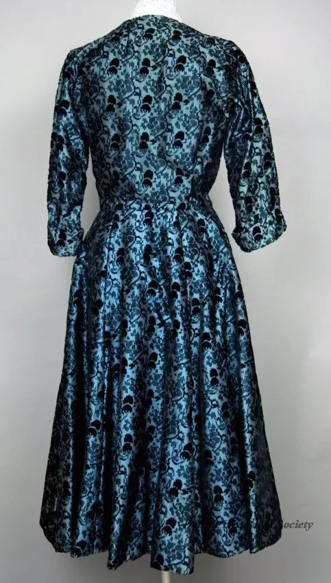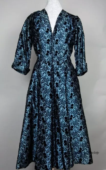 One lady's cocktail dress of black velvet on blue silk. The A-line dress has a V-shaped neckline and 3/4 length, set-in sleeves that are notched and cuffed at the bottom. The dress has a natural waistline and the mid-calf length circle skirt is gored at the back and pleated in the front. The dress has a front zipper closure with an overlapping hook and eye panel at the waist. The skirt is lined in black buckram. Attached under the arms are granulated garment shields with the stamp "Klienel's Modine, size 4".