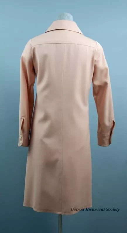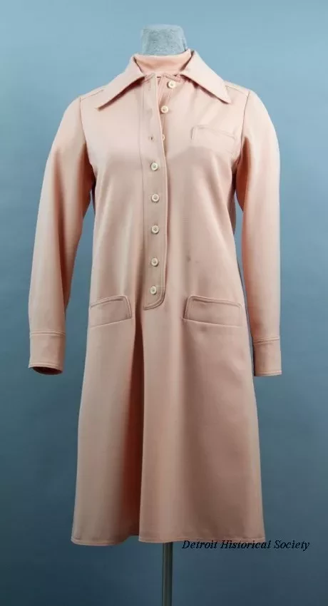 One woman's dress made of peach-colored polyester twill fabric with a separate matching polyester knit top. The shift dress has a wide pointed collar, long sleeves with cuffs, eight off-white plastic buttons down a center front placket, two front pockets at the hip, one pocket on the left breast, and a light peach-colored acetate lining. Each cuff has two buttons which match the style of the center buttons. Labels on the inside back collar read "Anne Klein," and "Dry Clean Only." The dress incudes a faux turtleneck halter top that can be worn beneath the dress.