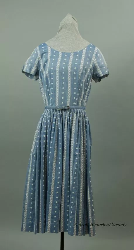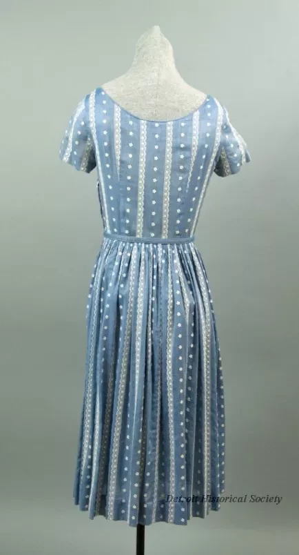 One lady's summer dress. The dress is made of a sheer blue handkerchief linen fabric with vertical stripes of white lace and vertical lines of white embroidered flowers. It has a low round neckline, short sleeves, a very filled bodice, a zipper closure on the left side, a natural waist, a separate narrow matching fabric belt, and a gathered skirt with a hemline ending at the knee. A label on the inside back of neck reads "Glass Original, New York."