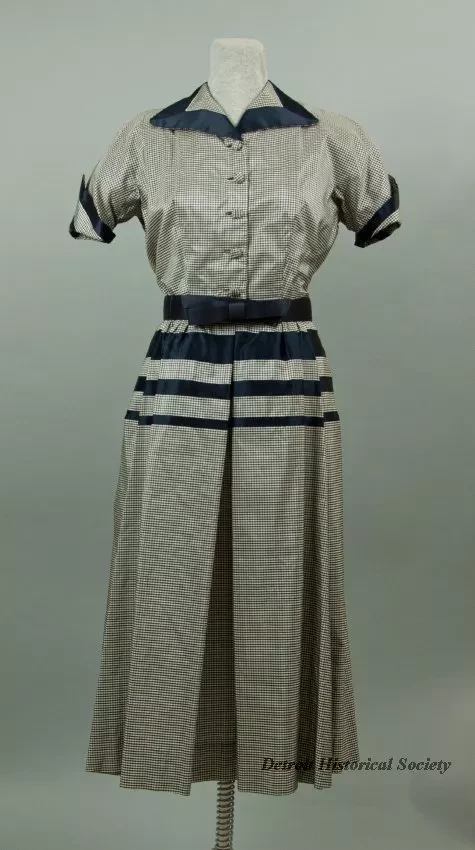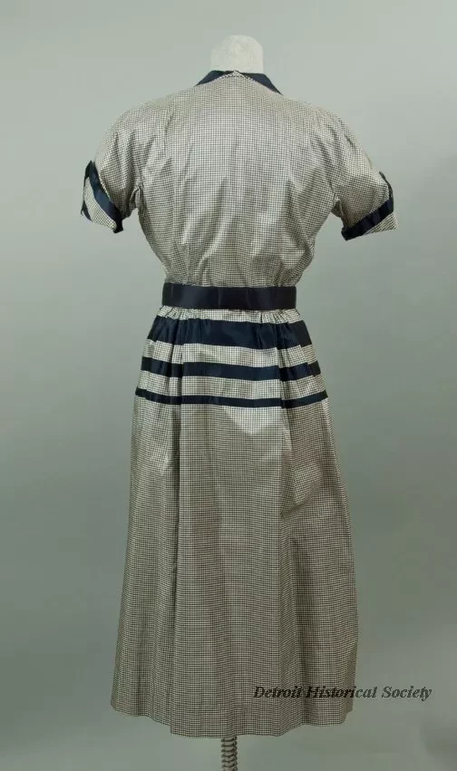 One lady's dress. The shirtwaist style dress is made of a lightweight navy/white check silk taffeta fabric with horizontal bands of navy satin. It has a small V neck with pointed collar, short cap sleeves with pointed cuffs, five fabric-covered buttons down the center front, and a natural fitted waist. The full pleated skirt has hidden pockets in the front pleats and a hemline ending below the knee. A separate navy satin belt with bow is also included. There are no manufacturer's labels.