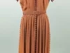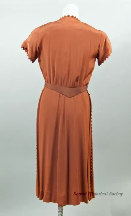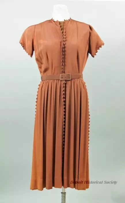 One lady's medium brown silk crepe dress. The dress has a round neck, short sleeves, removable shoulder pads, a gathered skirt, a zipper closure at the front, a matching fabric-covered belt, and a hemline ending below the knee. The neckline, sleeves, front opening, and skirt side seams are all edged with folded "points" made of matching fabric. A label on the inside back waistband reads "Nettie Rosenstein."