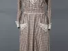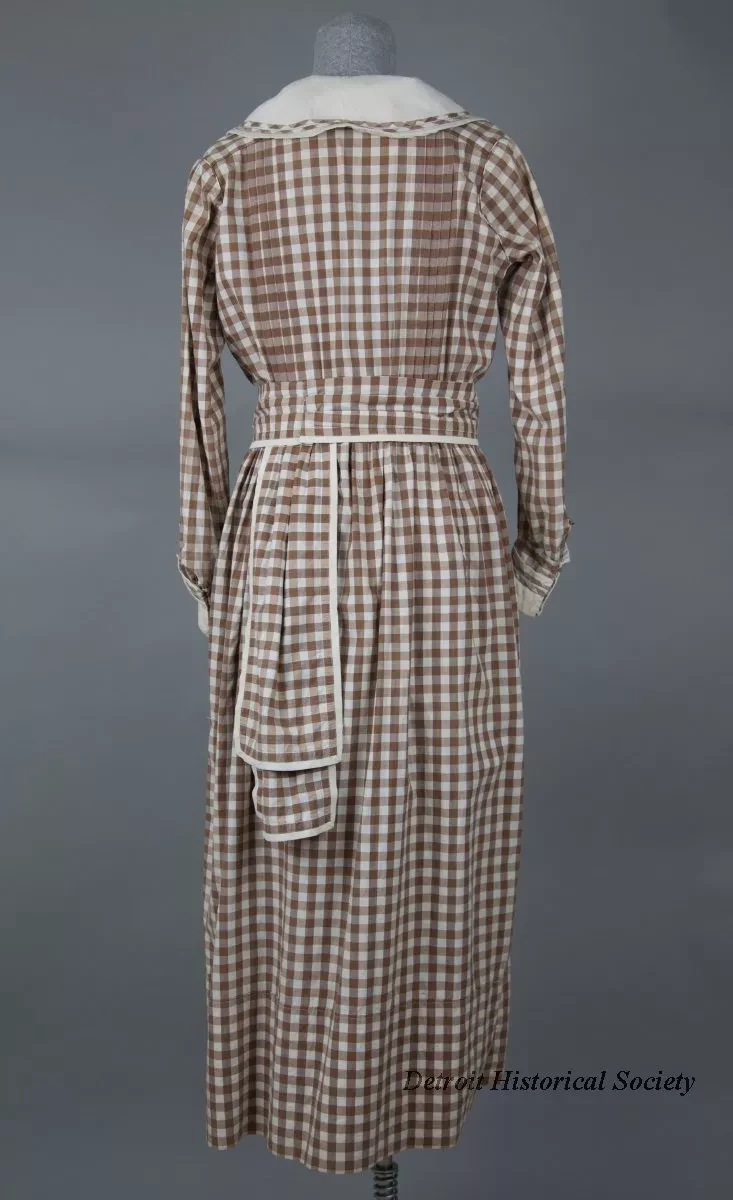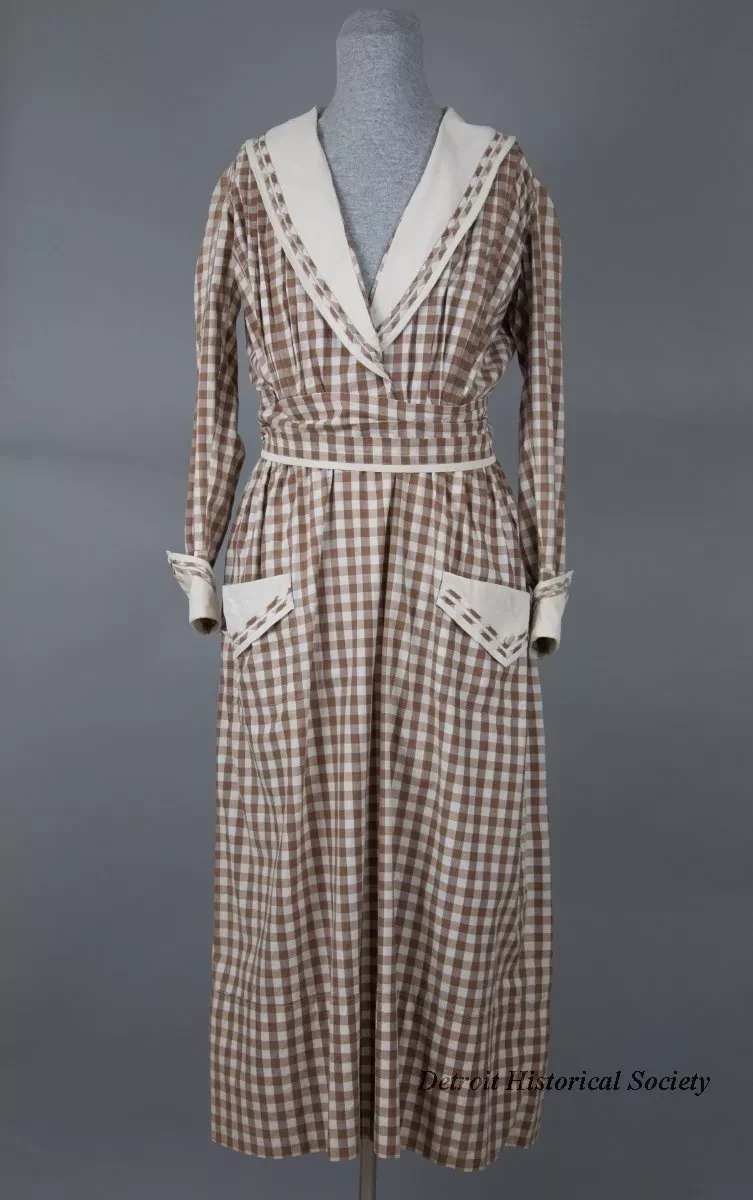 One lady's cotton dress in a brown and white check gingham pattern. The dress has a wide white shawl collar that forms a V above the front waist. The collar is trimmed with two narrow bands of brown and white check fabric. The dress has long sleeves, white cuffs with trim that matches the collar, a pleated bodice, snap closures at the front waist, and a pleated cummerbund of matching fabric. The long, full skirt is slightly flared and has side pockets with trim that matches the collar and cuffs. Two loose panels hang down back waist. A label on the inside back of the waist reads "Grande Maison De Blanc, New York."