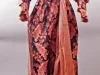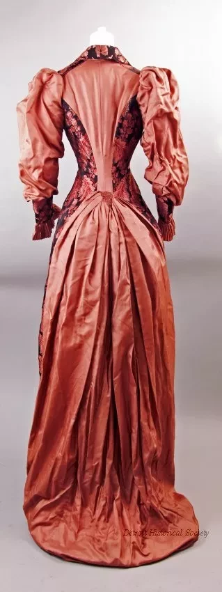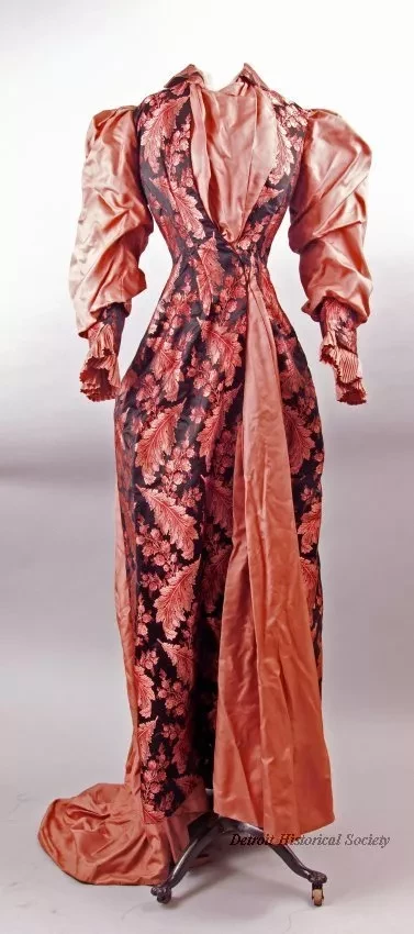 One lady's brown/rose ribbed silk fabric and black/rose silk brocade dress. The one-piece dress has a small pointed collar with a deep V-line ruffle at the front, long sleeves with puffed shoulders, pleated ruffles on the cuffs, and hook/eye closures down the center front. The front and sides of the fitted and padded bodice are made of a black/rose brocade fabric that has an oak leaf design. The brocade fabric is also used on the collar, cuffs, and sides of the skirt. The dress has a full skirt with alternating panels of plain and brocade fabric. The skirt is lined with brown cambric fabric and has a slight train at the back. The silk fabric is gathered at the back waistline to form small bustle. No manufacturer's labels are shown.