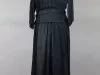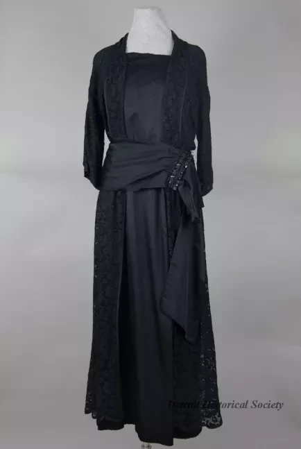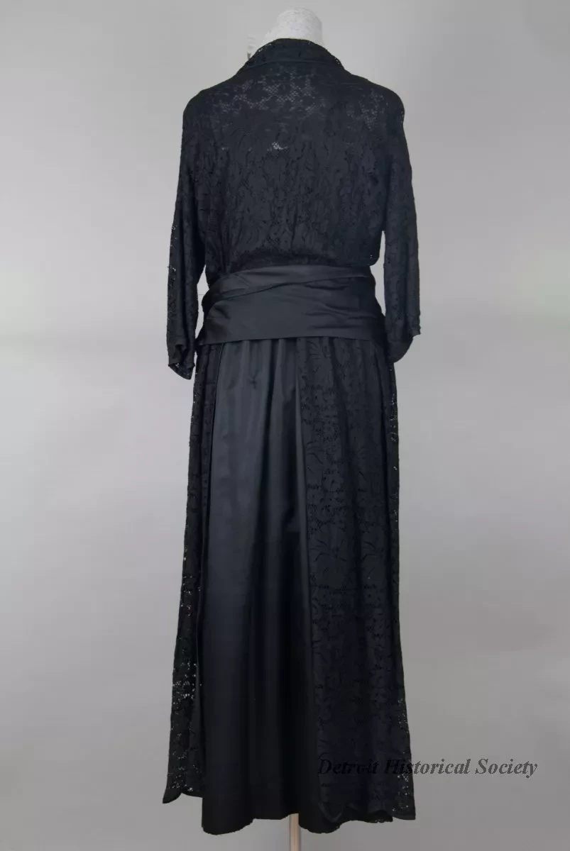 One lady's dress of black rayon silk and black lace with a floral design. The dress has a lace top with a shawl collar, 3/4 length sleeves, and inner front/back panels of black rayon silk. The unlined ankle-length skirt is slightly flared and is covered with matching panels of black lace at the sides. A black rayon silk cummerbund is gathered at the left side with a jet clasp. Snap closures are located on the left front along the inner edge of the lace collar from the neckline to the waist. No manufacturer's labels are shown.