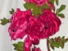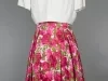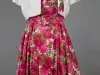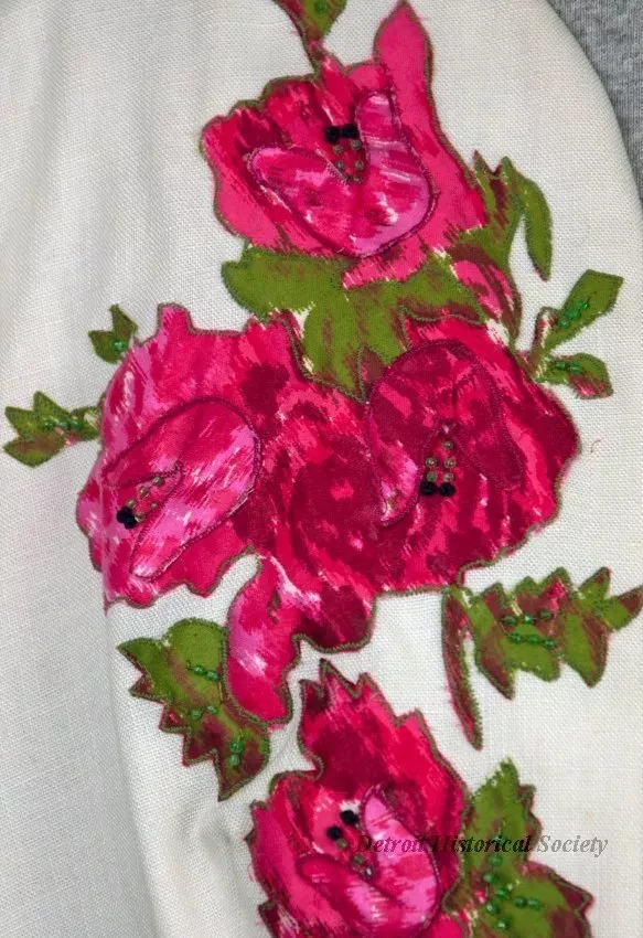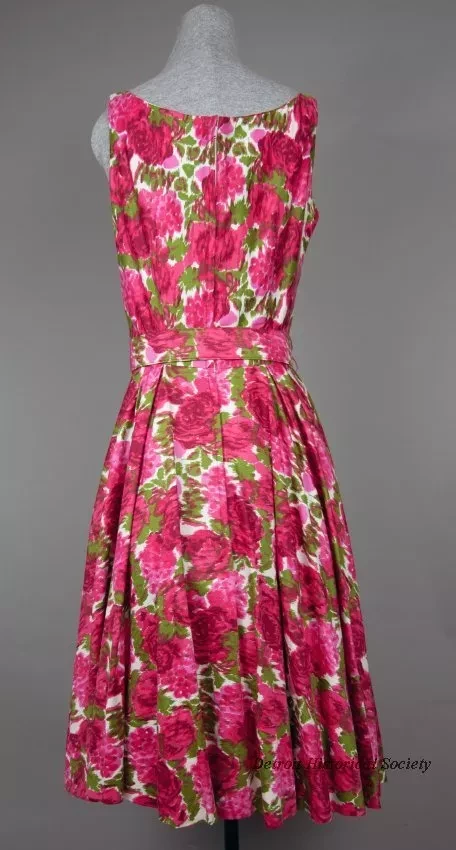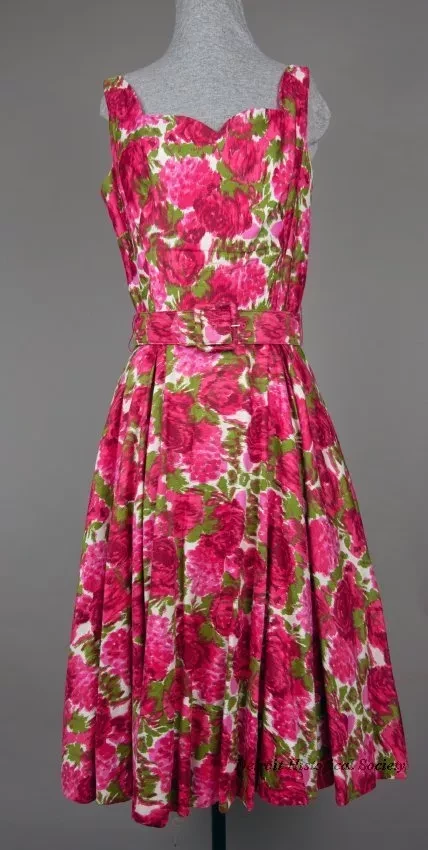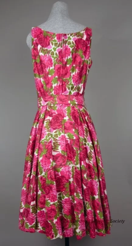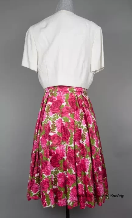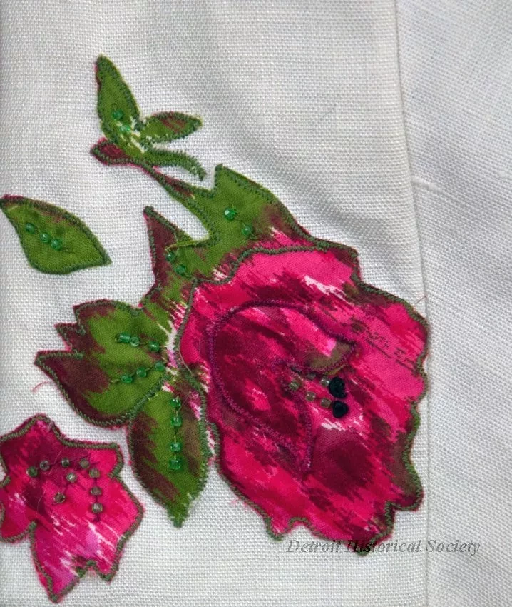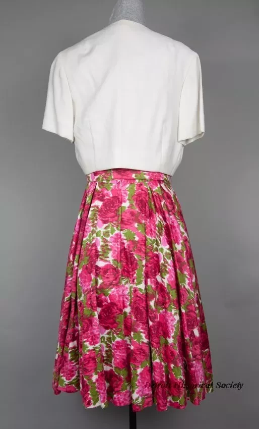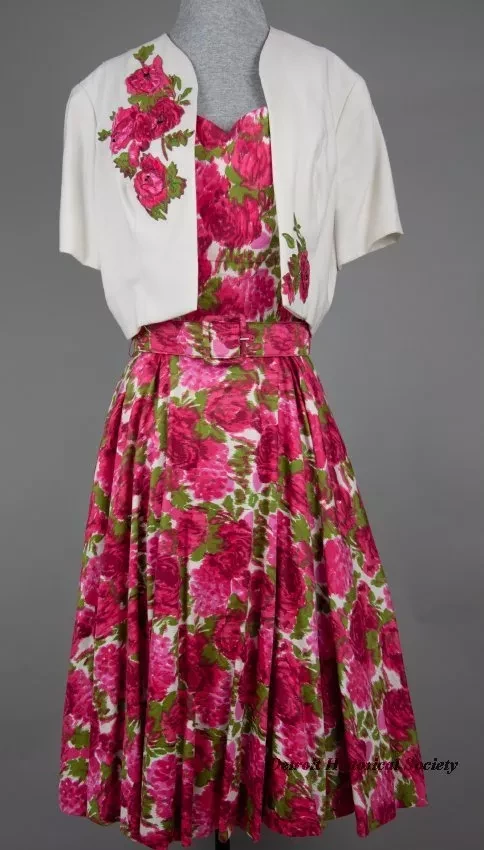 One lady's rose and green cotton floral print dress (a) and jacket (b). The sleeveless A-line dress has a sweetheart neckline, matching floral belt and zipper closure, located at the center back The dress has a nylon mesh crinoline underlayer that attaches at the interior waist seam. The waist-length white linen jacket has half-sleeves and floral appliques that match the material of the dress. The floral appliques include hand-stitched beadwork detail. No manufacturer's labels are present.