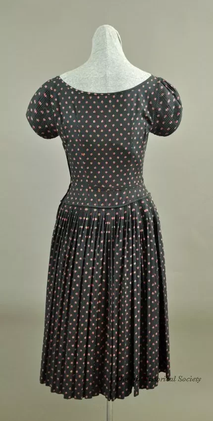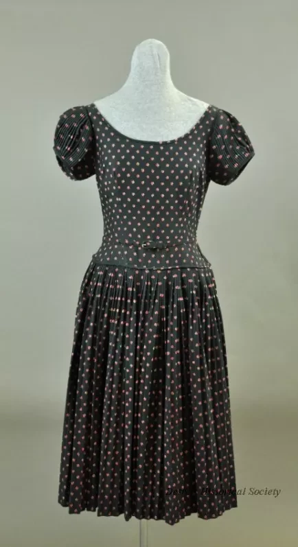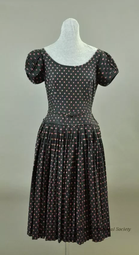 Woman's one-piece dress in a black cotton print with red roses and green leaves. The dress has a round low neck, side zipper, hook and eye at waist, accordion-pleat puff sleeves, and a dropped waist. The knife pleated skirt is very full and reaches to mid-calf length. The dress has a narrow belt. Label: Youth Guild of New York. Purchased at the D.J. Healy Shops, Detroit.