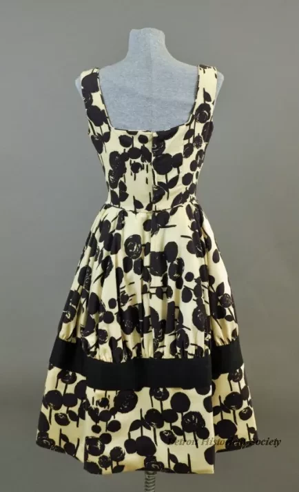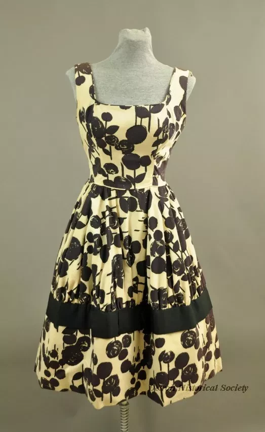 Woman's sleeveless black and white print cotton pique dress. The print pattern consists of abstract flowers and stems. The dress has a fitted bodice with a low, square neckline, a full below-knee length skirt, and a crinoline underskirt. The outer skirt is gathered at the waistline. Piping and a wide black ribbon encircles the skirt which gives it fullness. The black ribbon has a simple bow on the front. A 9" zipper closes the back. Label: Saks Fifth Avenue.