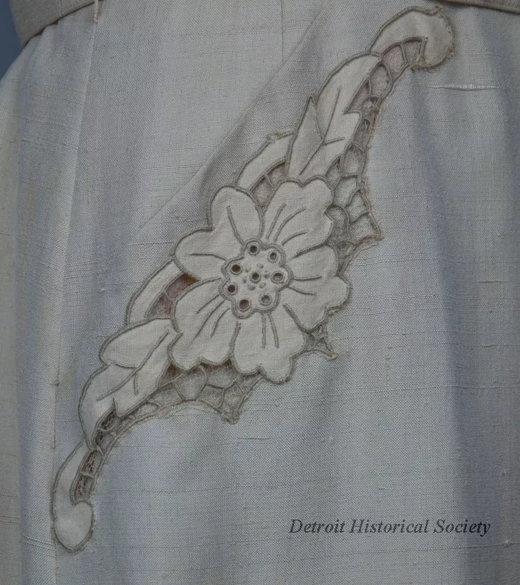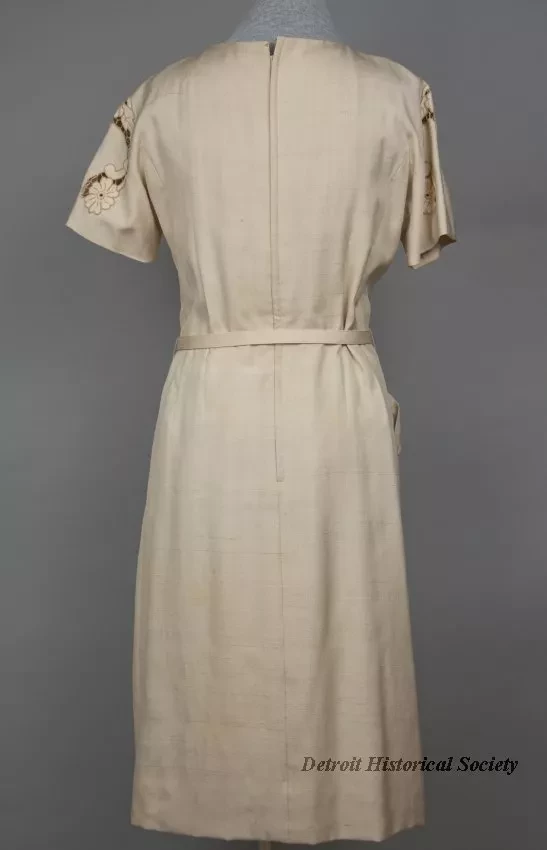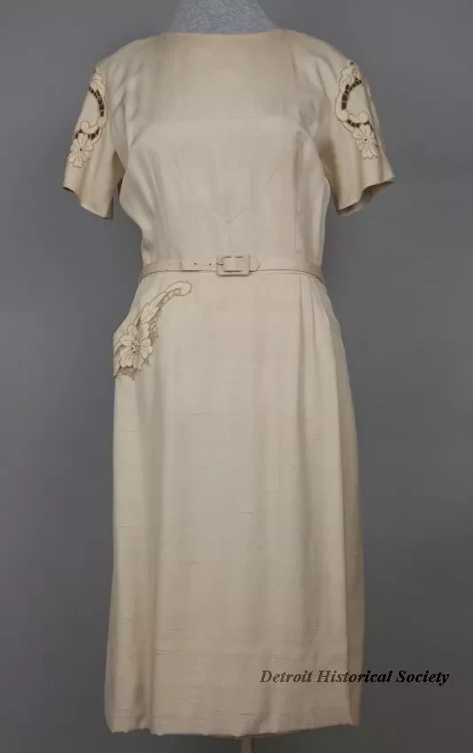 One lady's beige linen dress. The dress has a wide jewel neckline and short raglan sleeves that are embellished with floral cutout lacework. The lacework is mirrored on the hip slash pocket that is located on the right-hand side of the skirt. The skirt has two thread belt loops and a belt of matching fabric. The inside of the belt reads "16 Paul Parnes 278." The dress is lined in lightweight nylon mesh and has a center back zipper closure with a hook-and-eye located at the top zipper stop.
