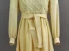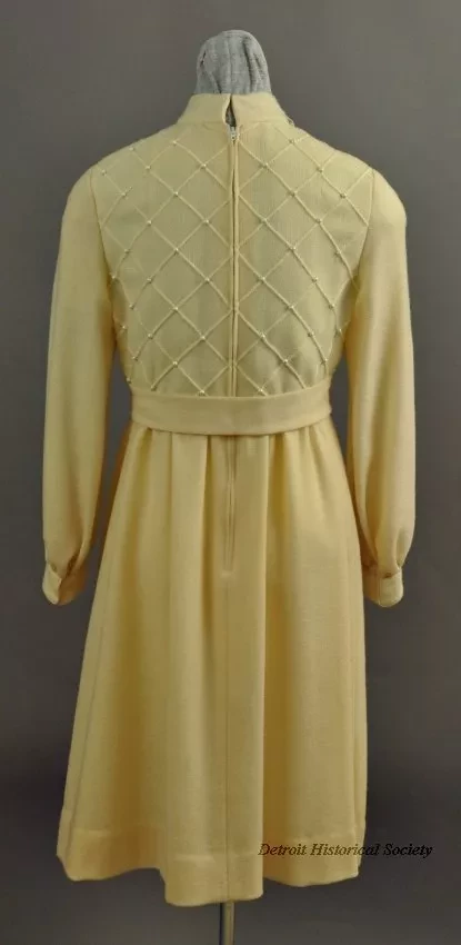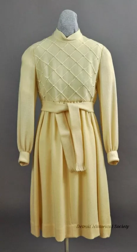 Woman's cream wool wedding dress. The dress has a stand-up collar, long sleeves with 2-inch gathered cuffs and snap closures, a zipper closure at the back, and a skirt hemline ending at mid-calf. The bodice is empire-waisted with diagonal stitching across the front and back and pearl-like beads attached at the stitchline crossings. The dress is fully lined with a cream-colored rayon/acetate. A separate matching self-tie sash with fringed ends is included. Label at inside back of neck: "A.F. Boutique, Anne Fogarty."
