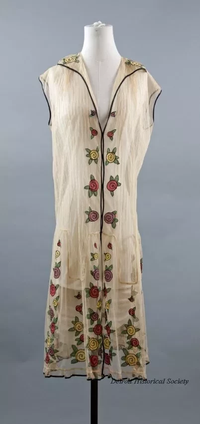 One lady's cover-up dress for beach or pool wear. The sleeveless, knee-length ,chemise style dress is made of white tulle fabric. It has a roll-over collar, a deep V neck, fine vertical tucks in the bodice, and a ruffled hem. Edges have black cotton bias piping. The skirt, front, and collar have applique roses of red, yellow and purple cotton. No manufacturer's labels are shown.