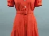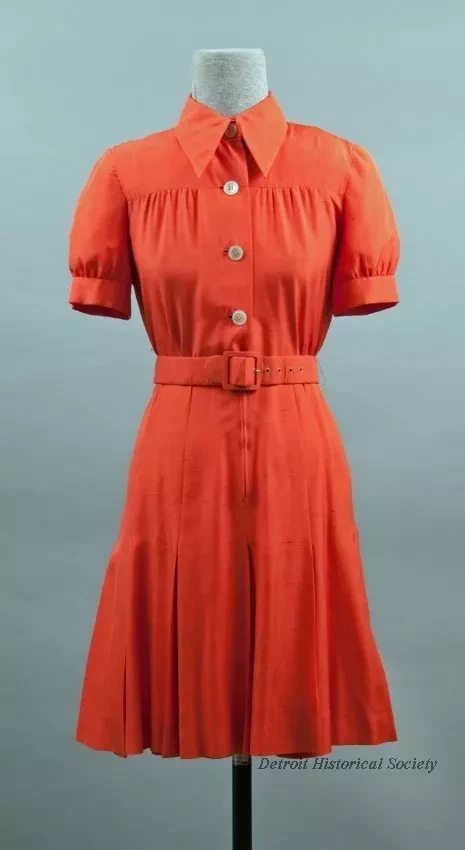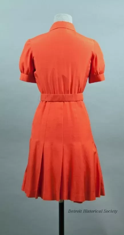 One lady's orange silk dress. The tailored, partially-lined, shirtwaist style dress has a pointed collar, short sleeves slightly-gathered to 1.5-inch wide cuff bands, and a yoke in front with small gathers. It has three large mother of pearl buttons down the center front and a short zipper closure at the center front. The short skirt is fitted below the hipline and has box pleats around the lower half. A separate 1.5-inch wide matching fabric belt is included. A label on the inside back of neck reads "Boutique Valentino, New York, Rome. Made in Italy," and "8."