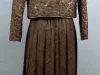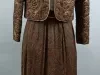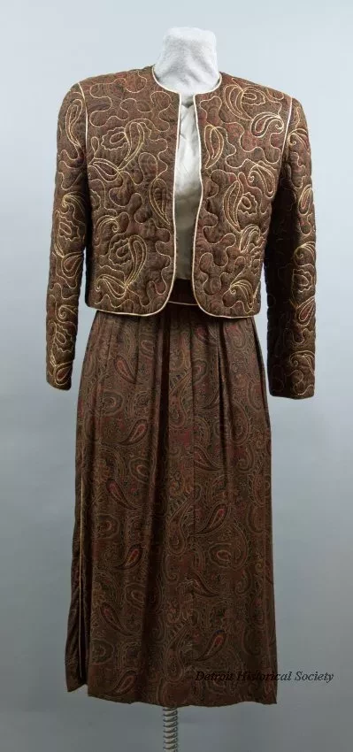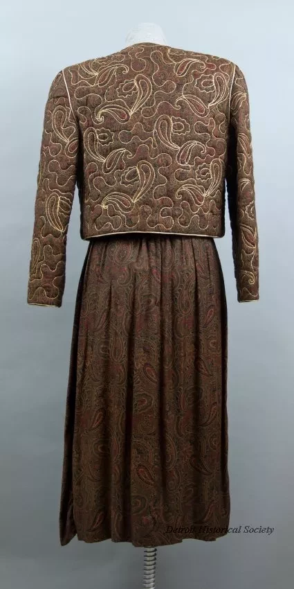 One lady's skirt and jacket made of wool challis fabric in a brown paisley print. The waist-length, bolero style jacket is made of quilted fabric and has a dark brown acetate lining. It has long sleeves and is trimmed with gold-colored braided cord around the neck, down the front, along the bottom, at the shoulders, and the lower edges of the sleeves. Gold-colored thread is sewn irregularly around various paisley patterns and creates a quilted effect. Labels on the inside back of the neck read "Pierre Cardin, Paris, New York," and "Neiman-Marcus." The unlined skirt is made of the same brown wool challis fabric as the jacket and has a hemline that ends below the knee. The skirt fabric is gathered along a 2-inch wide waistband. It has side pockets and a zipper at the center back that has a placket cover. The waist band is outlined in the same gold-colored braided cord as on the jacket. Braided cord also runs down the two side seams from the waist to the hemline. Labels on the inside waistband read "Pierre Cardin, Paris, New York," and "Neiman-Marcus." A separate fabric care label reads "Dry Clean Only."