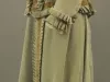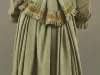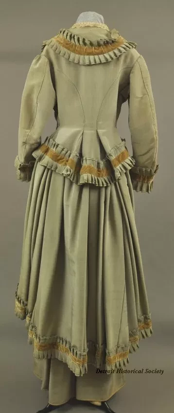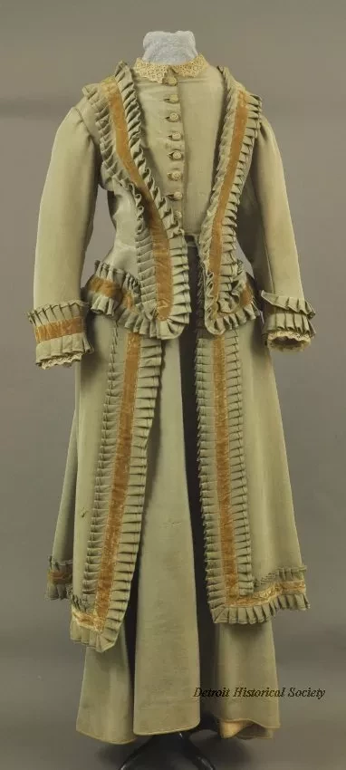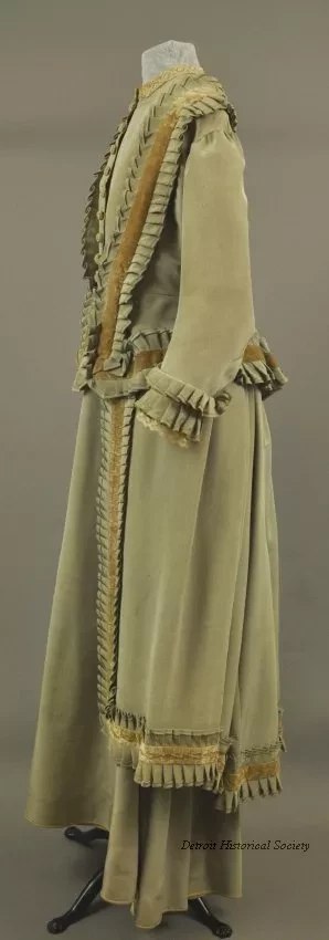 Wedding dress of Mrs. Harriette Anna Warner Bishop. The 3-piece dress is made of gray/green silk and wool. It has a fitted bodice with a small lace collar, long sleeves, buttons down the front, and a bottom edge that ends below the waist. The bottom edges, front, shoulders, back neckline, and cuffs are all trimmed with a decorative band of ruffles and green velvet. The matching full-length skirt has a hook/eye closure and a hidden side pocket. An overskirt is also included. The overskirt is open at the front, has a hemline that ends below the knee, and is finished along the edges with the same style of trim that was used on the bodice.