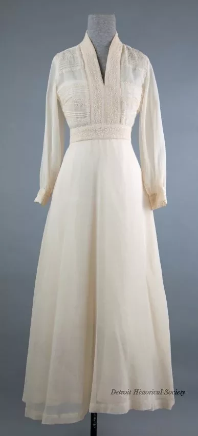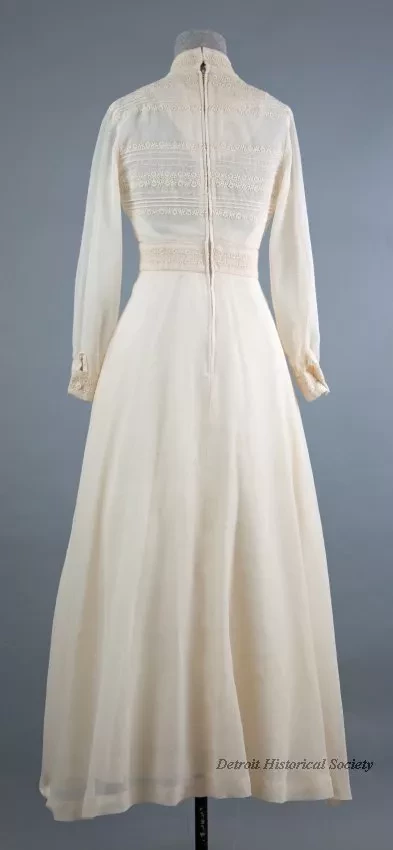 One wedding dress made of two layers of a thin cotton/polyester fabric in an ivory color. The dress has a short upright collar with a V-neck in front, long sleeves with embroidered cuffs, a slightly fitted bodice with a high waist, and a zipper closure at the back. The bodice and cuffs are decorated with an ivory-colored floral embroidery design. The full skirt has gores at the sides and is slightly flared. A label on the inside back of the collar reads "Avalon Classics, Inc." A second label gives washing and fabric care instructions.