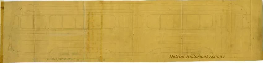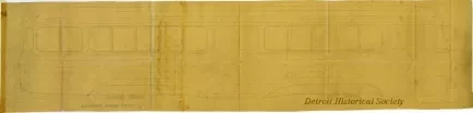 Large pencil drawing on yellow tracing paper of the right side elevation of Pullman Company's Model B, an experimental streetcar designed by John Hession, Jr. based on specifications from Dr. Clarence F. Hirshfeld of the Electric Railway Presidents' Conference Committee. The drawing was done at one inch scale for the construction of the model of the car. Circled numbers are beside several features of the design. A separate label included with the drawing reads: